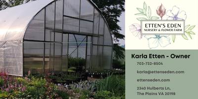 September 22 , Etten’s Eden: Boutique Plant Nursery & Floral Design, your destination for Perennials, Annuals, Aquatics, Natives, Shrubs, Trees, and more! We’re busy working hard to finish up our inventory, set up the nursery, and hardening off the annuals. 2340 Hulberts Ln, The Plains, VA 20198